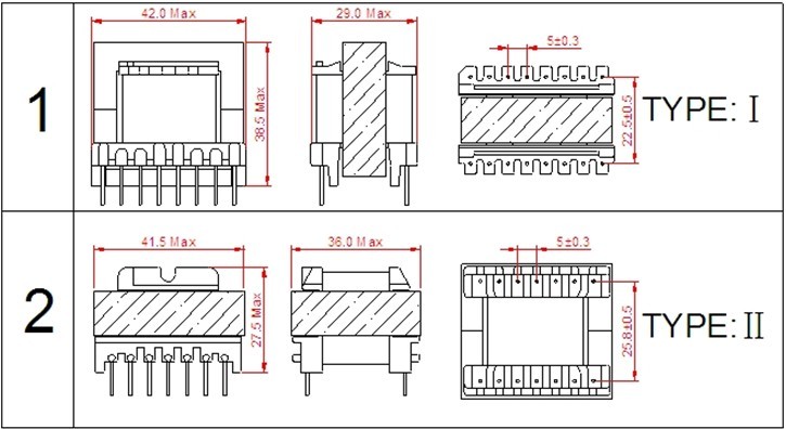 以上为公司常用骨架样式,其它款式暂未列入其中,欢迎咨询。本公司可按客户要求定制各种规格EE40高频变压器。